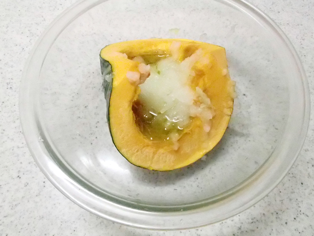 1.耐熱ボウルにかぼちゃを入れ、くぼみのところにオリーブオイル、玉ねぎ、塩をふり、ふんわりとラップをする。