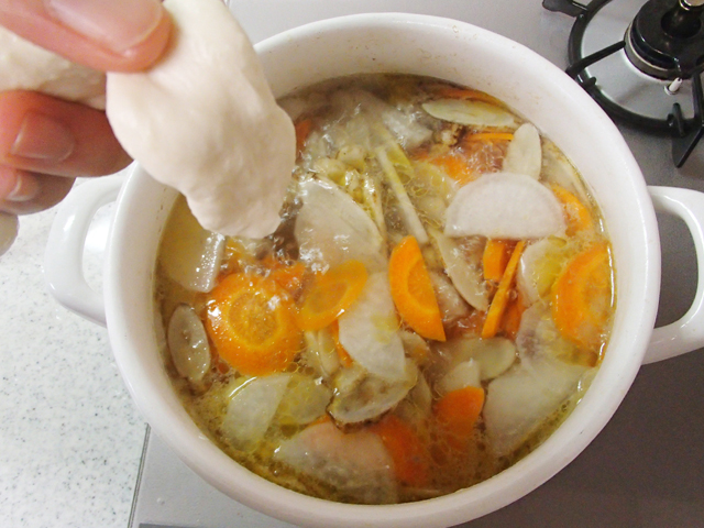 4.【3】に残りの半量のだし汁、【1】のだんごを親指くらいの量をとって伸ばして入れる。10分ほど煮込み、しょうゆ、みりんを加えて塩で味を調える。