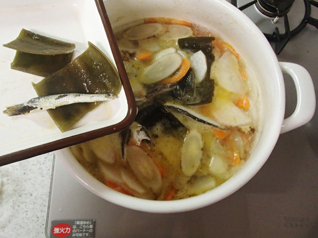 ※半分だけいれると野菜の火通り時間が短縮できます。にぼしとこんぶはこの時点で入れて煮てください。