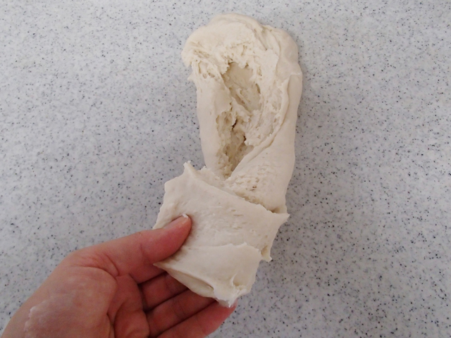 2.台の上で叩き、ねじり伸ばしてまとめる作業を繰り返す。全体的に弾力とツヤが出てきて薄い膜が張るようになったら、丸め直す。