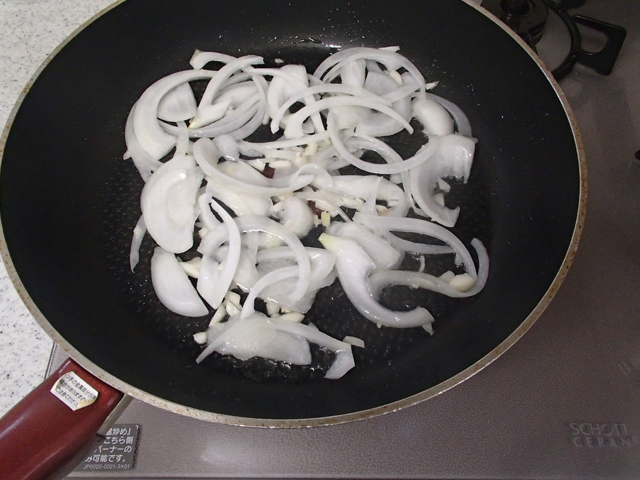 1.フライパンににんにく、油を入れて熱し、玉ねぎを入れてさっと炒める。