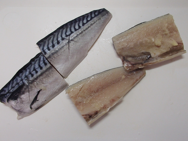 ・塩サバの半分に切り、皮に切れ目を入れる。