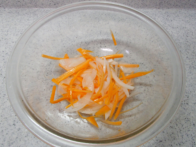 2.耐熱ボウルに玉ねぎ、にんじん、塩を入れ、しんなりとするまでもむ。