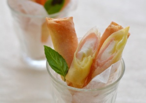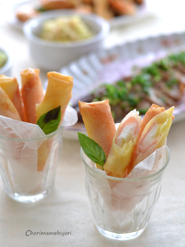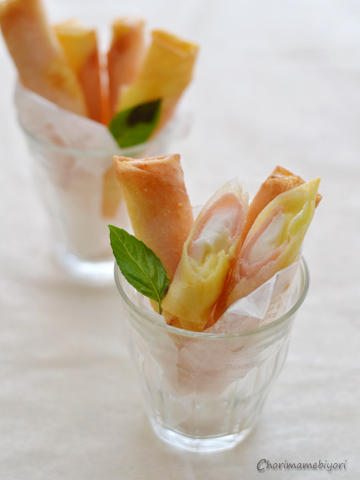春巻きの皮に置く食材の順番がチーズ溶け出すのを防ぎます。