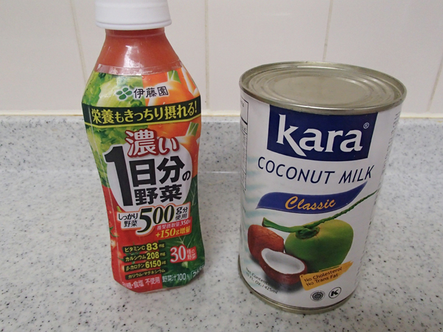 ココナッツミルクと使い切りたいのと、野菜ジュースを変えて作ってみたいのと、