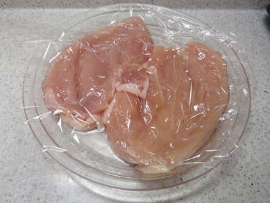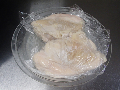 2.耐熱皿に鶏肉の皮目を下にして入れてラップをして電子レンジで4分加熱し、上下返してさらに2分加熱する。そのまま蒸らす。