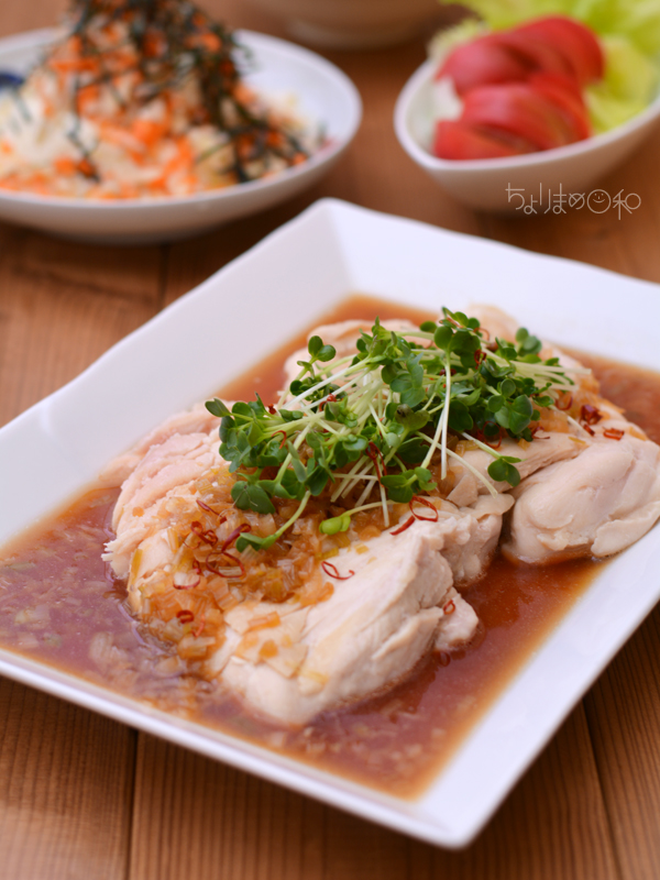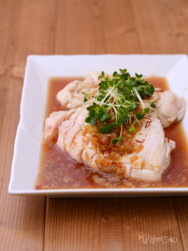 レンジで作る蒸し鶏だから、作るのも食べるのもこれ以上ないメインです。笑