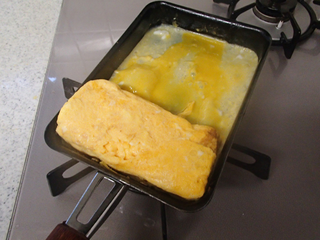 4.フライパンに多めの油をしき、ペーパーで吸い取り、【3】の卵液を入れて巻き、油を含ませたペーパーでフライパンをふき、卵液を入れて巻く。