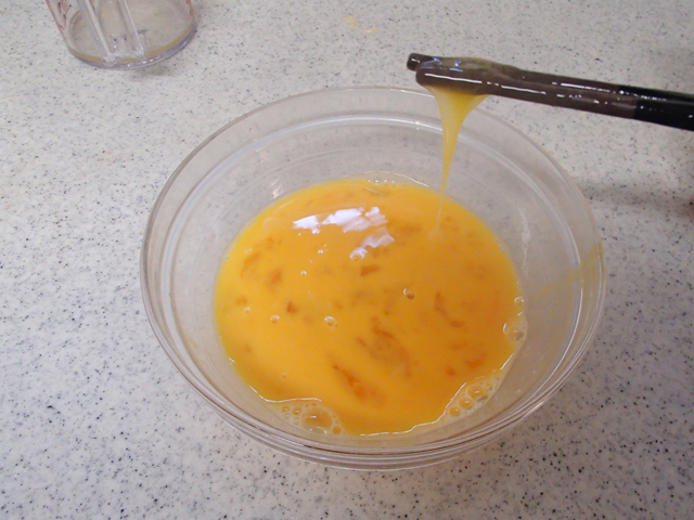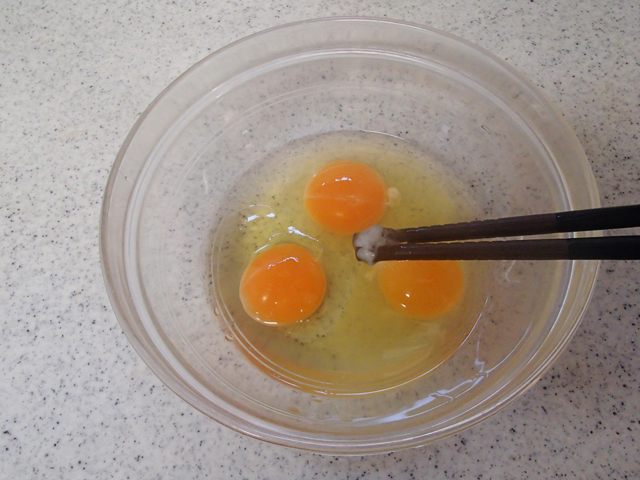 1.ボウルに卵を入れてカラザ(白いひものようなもの)をお好みでとる。