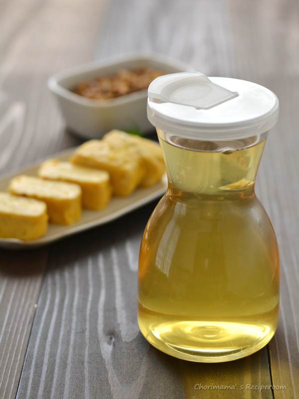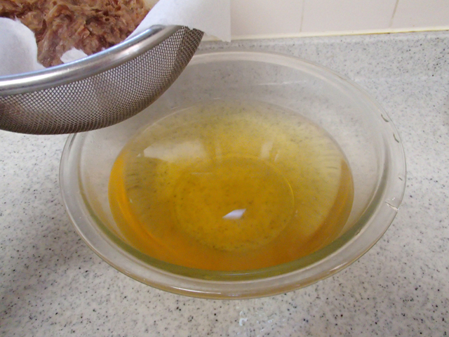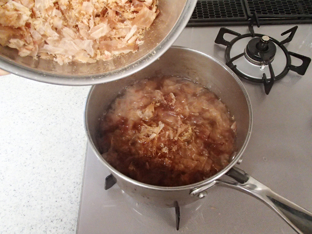 1.沸騰した湯に花かつおを入れて火を止め、かつおぶしが表面から沈むまでおく。キッチンペーパーをしいたざるで漉す。(一番出汁)かつおだしの出来上がり。