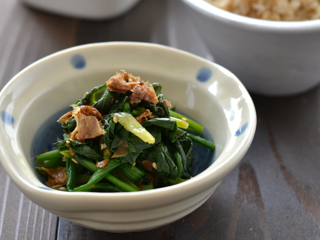 ●塩ゆでした青菜をしょうゆで洗い(しょうゆをかけて和えて水気をしぼる)、【和え物の素】を和えて出来上がり。