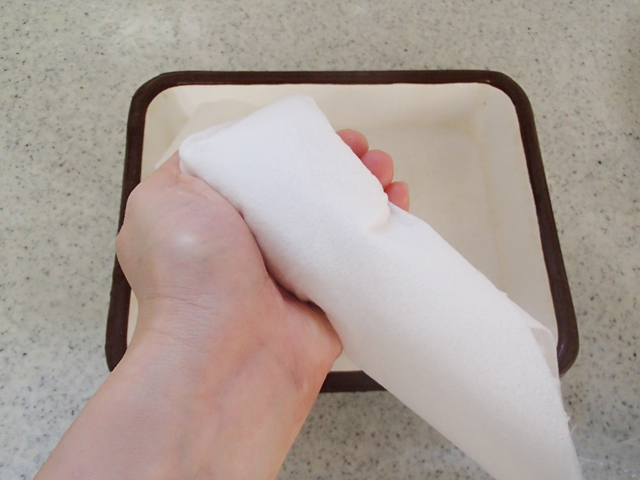 →豆腐1/4丁を厚手のペーパーに包み、徐々に力をいれながら水気をきる。