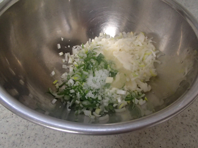 1.ねぎ、酒、塩、ゼラチンを合わせてしんなりするまでもむ。