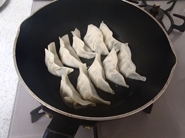 4.フライパンに油を入れて中火で熱し、【3】を10~15個くらいを目安に並べ、底面に焼き色がつくまで焼く。水(50cc程度)を餃子にかかるように回しかけ、蓋をして中火のまま蒸し焼きにする。