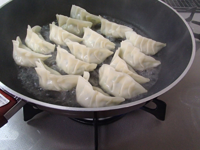 餃子の底に焼き色がついてから水を入れて蒸し焼きに。