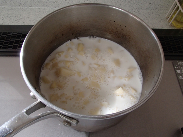 2.鍋にじゃがいも、じゃがいもがヒタヒタになる量まで牛乳を注ぐ。弱火にかけて火が通るまでじっくりと煮る。