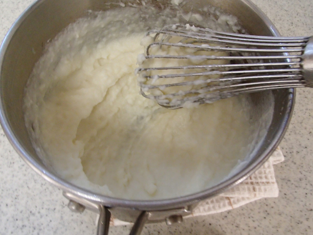 3.じゃがいもがやわらかくなったら、バターを入れて泡だて器で滑らかになるまで混ぜる。塩、こしょうをして味を調える。