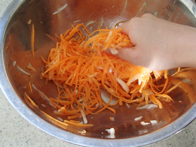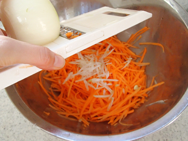 1.にんじん、玉ねぎはスライサーで細切りにする。