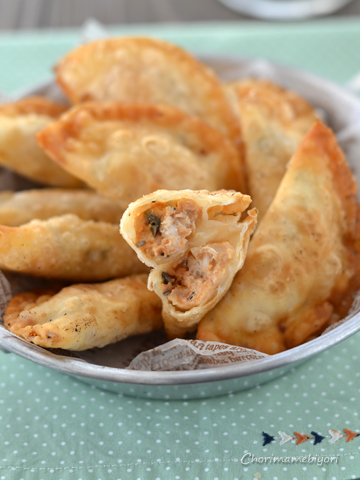 スペインの定番「エンパナーダ」。食べやすい小さいサイズ「エンパナディージャ」で、作りやすいように餃子の皮で仕上げました。名産をたっぷり詰めていただきます!