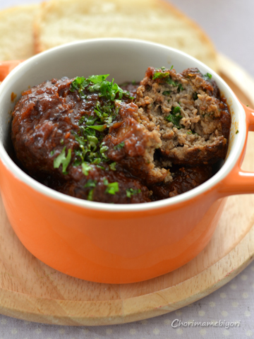 スペインの定番パセリをたっぷり入れたアルボンディガス(肉だんご)。スペインの名産品ワインをたっぷり使ったお手軽ソースと一緒にいただきます。パンとの組み合わせは絶品!