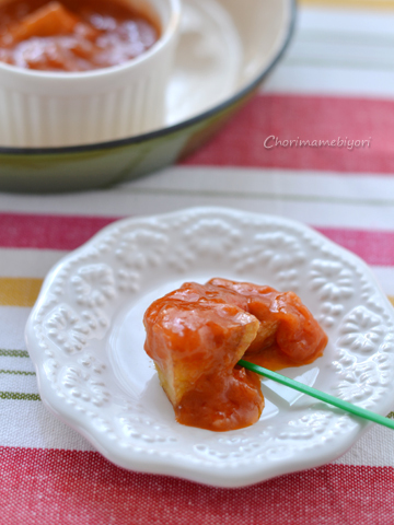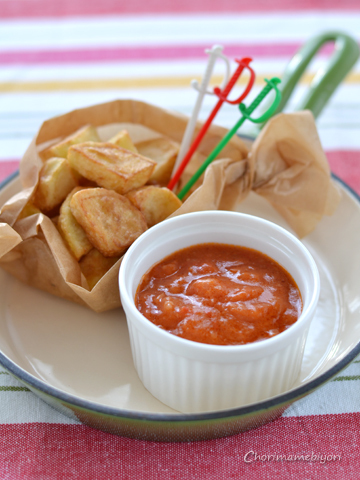 スペイン料理の定番のピリッと辛いトマトの「ブラバスソース」。簡単に、食べきれる量に仕上げました。「あと辛」方式だから、子供用・大人用のチェンジも楽々!定番のポテトフライもオススメですが、オリーブオイルでソテーしたしいたけも美味☆