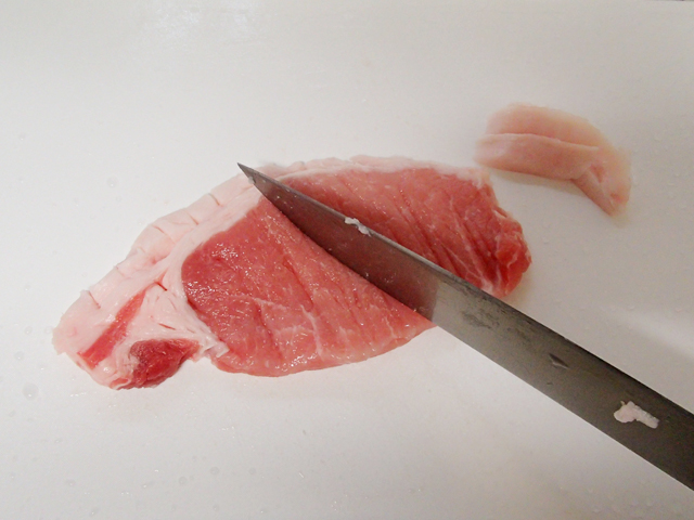 1.豚肉は脂身が多い場合は少し取り除き、脂身と赤身の境目に包丁んの先で数か所刺して筋切りする。