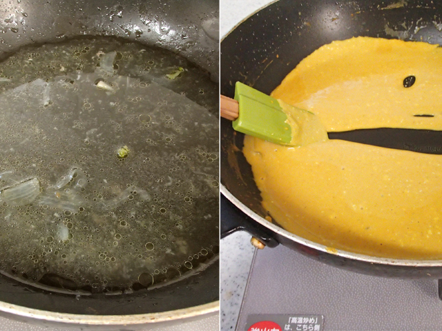 6.煮汁にAを合わせて溶かし混ぜ、火を止めたときに線がかける程度なるまで煮詰める。【3】に濃厚カレーソースを添える。