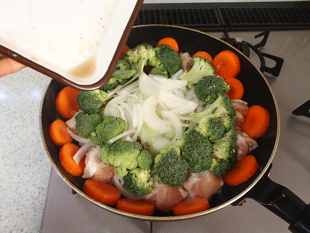 2.フライパンを中火にかけ、手羽元の皮の面を下にして並べる。中央に玉ねぎ、鍋肌ににんじん、手羽元の上にブロッコリーをのせて、下味の残りの汁をかける。