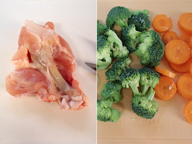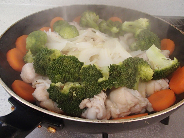 ・玉ねぎは薄切り、にんじんは輪切り、ブロッコリーは小房に分ける。