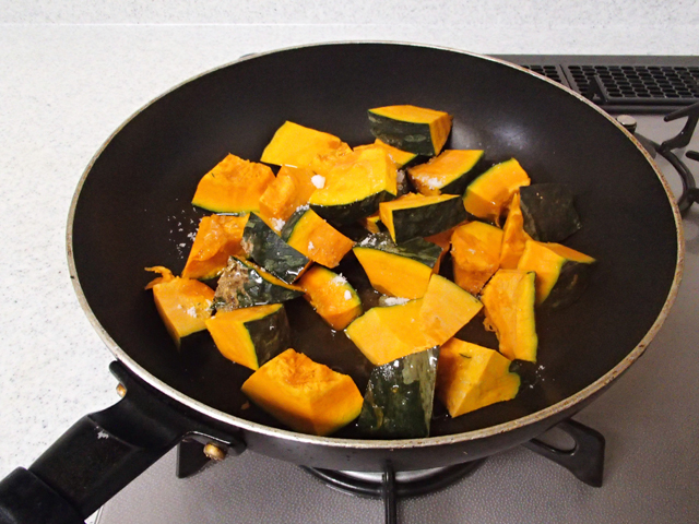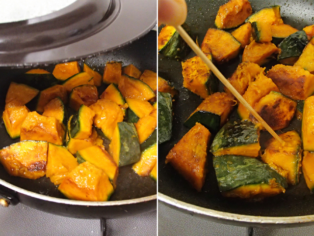 蒸し焼きの途中で何度かフライパンをゆすって、かぼちゃの位置をかえると満遍なく火が通ります。