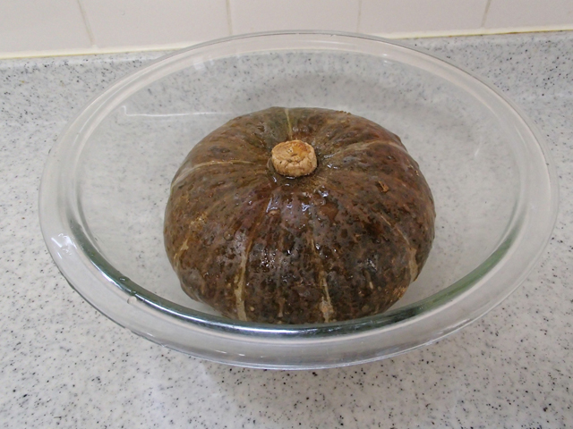 1.(坊ちゃん)かぼちゃは水で洗い、水にくぐらせ耐熱ボウルに入れる。ラップをしてレンジで8分加熱し、5分ほど蒸らす。