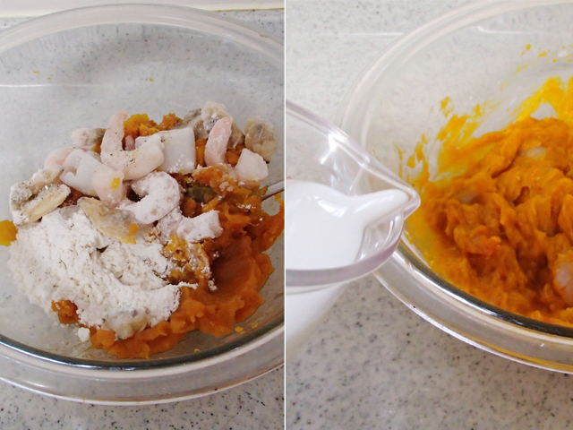 3.【2】の身の部分とAを合わせ、牛乳を少しずつ注いで混ぜ合わせる。