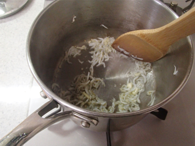 1.鍋にオリーブ油、にんにくを入れて熱し、しらすを入れてさっと炒める。