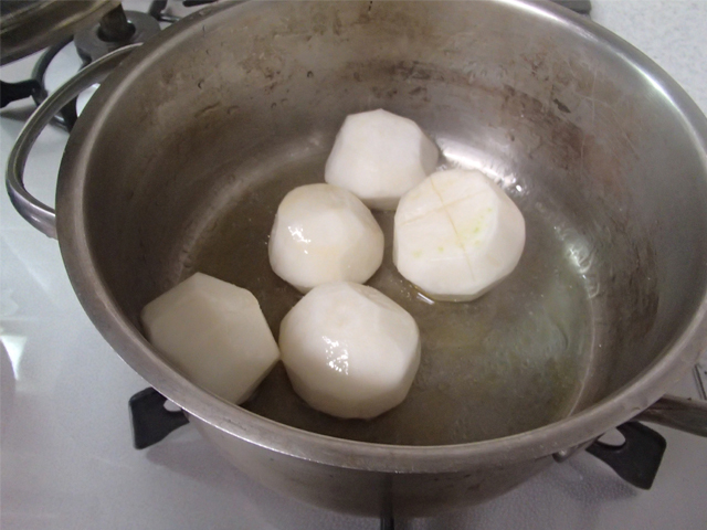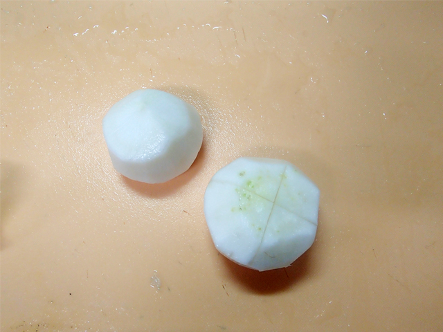 ・かぶは皮をむき、十字に切り込みを深めに入れる。