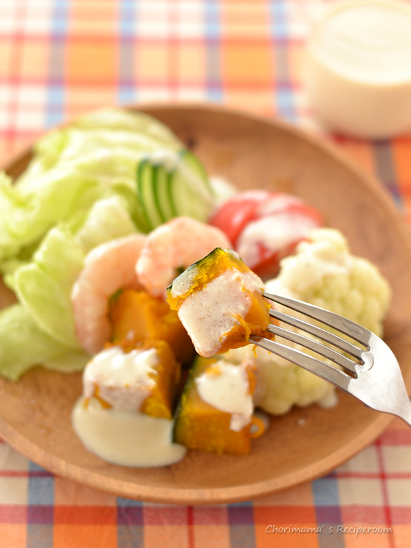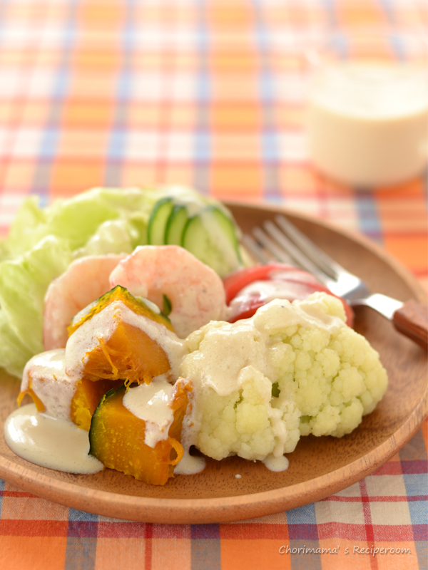 えび、カリフラワー、蒸しかぼちゃ、きゅうりトマト、レタスなどにかけていただきました♪