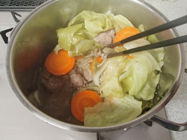 3.にんじん(厚さ0.5cm輪切り)、キャベツ(ちぎる)を入れる。