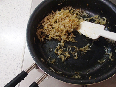 1.フライパンにごま油、にんにく、しらすを入れて、カリっとするまで火を入れる。