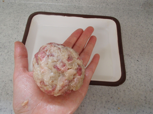 2.【1】のタネを4等分にし、手に油をつけてキャッチボールをして成形し、形を整える。