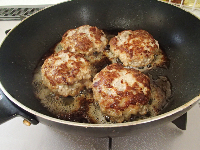 3.フライパンに油を入れて熱し、タネを入れて両面に中火で焼き色をつける。両面焼き色がついたら、蓋をして弱火で約10分焼く。