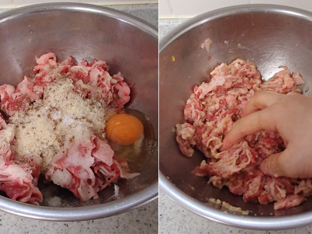 1.牛肉、Aを合わせて空気を入れるようにこね混ぜる。15分ほど冷蔵庫で休ませる。
