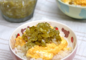 温かいごはんにのせて、ピーマンのピクルスをどっさりのせて。