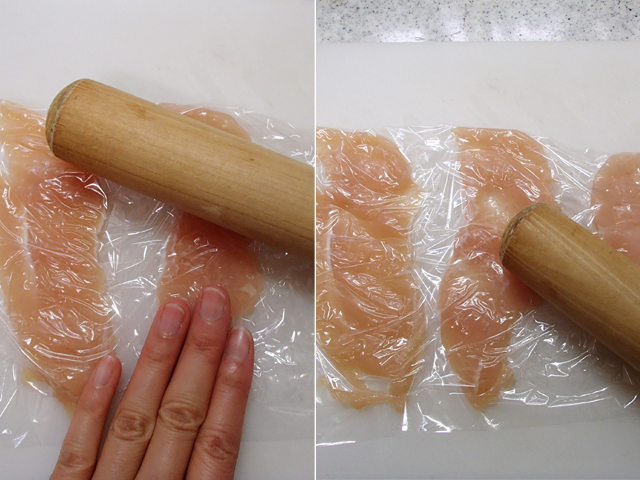 1.半分に切ったささみを4本ずつラップの上に間隔をあけて並べ、ラップをかぶせ、めん棒で軽く押して伸ばしてから、叩いて薄くする。