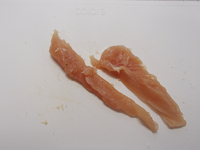 ささみを裏返して、筋の先をしっかりつまみ、包丁の背ですじを抑えながら包丁を横に動かしていく。