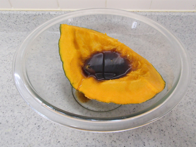1.耐熱ボウルにかぼちゃを入れてくぼみの部分に、酢、しょうゆを垂らす。