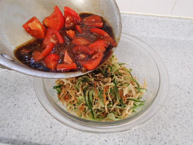 切り干し大根は、しっかりと水で戻さずに、トマトドレッシングを吸わせるようにします。