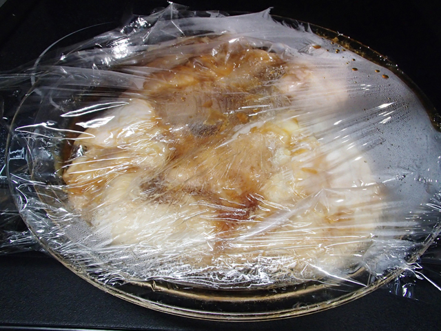 ラップの落し蓋をして下味をつけておくとつかりやすくなります。