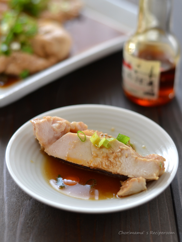 4.鶏肉の一番厚い部分を押して弾力を感じたら、2分ほど蒸らして切り分ける。汁をたっぷりとかけ、小ねぎ、白ごまを散らす。お好みでラー油をかけていただく。
