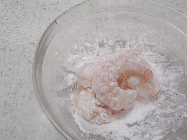 ・むきえびは塩水に浸して解凍し、水気をとる。多めに片栗粉をつける。