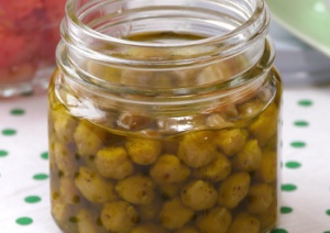 2.ひよこ豆があたたかいうちに煮沸消毒した瓶に入れ、にんにく、塩、オリーブオイルの順で加える。