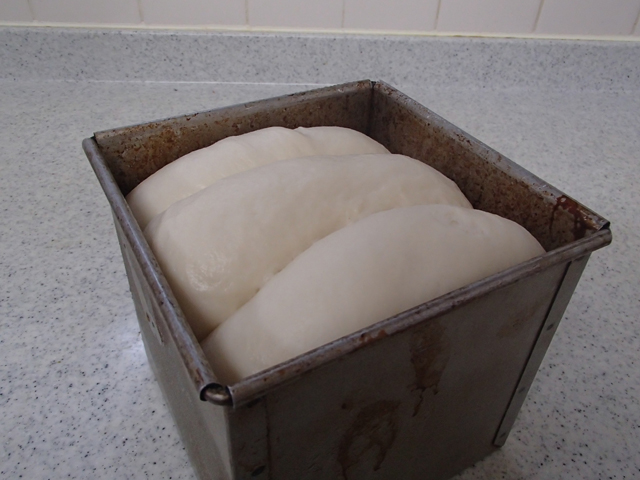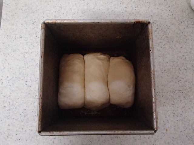 7.両サイドに手を添え、軽く転がして俵型に調える。食パン型に並べる。